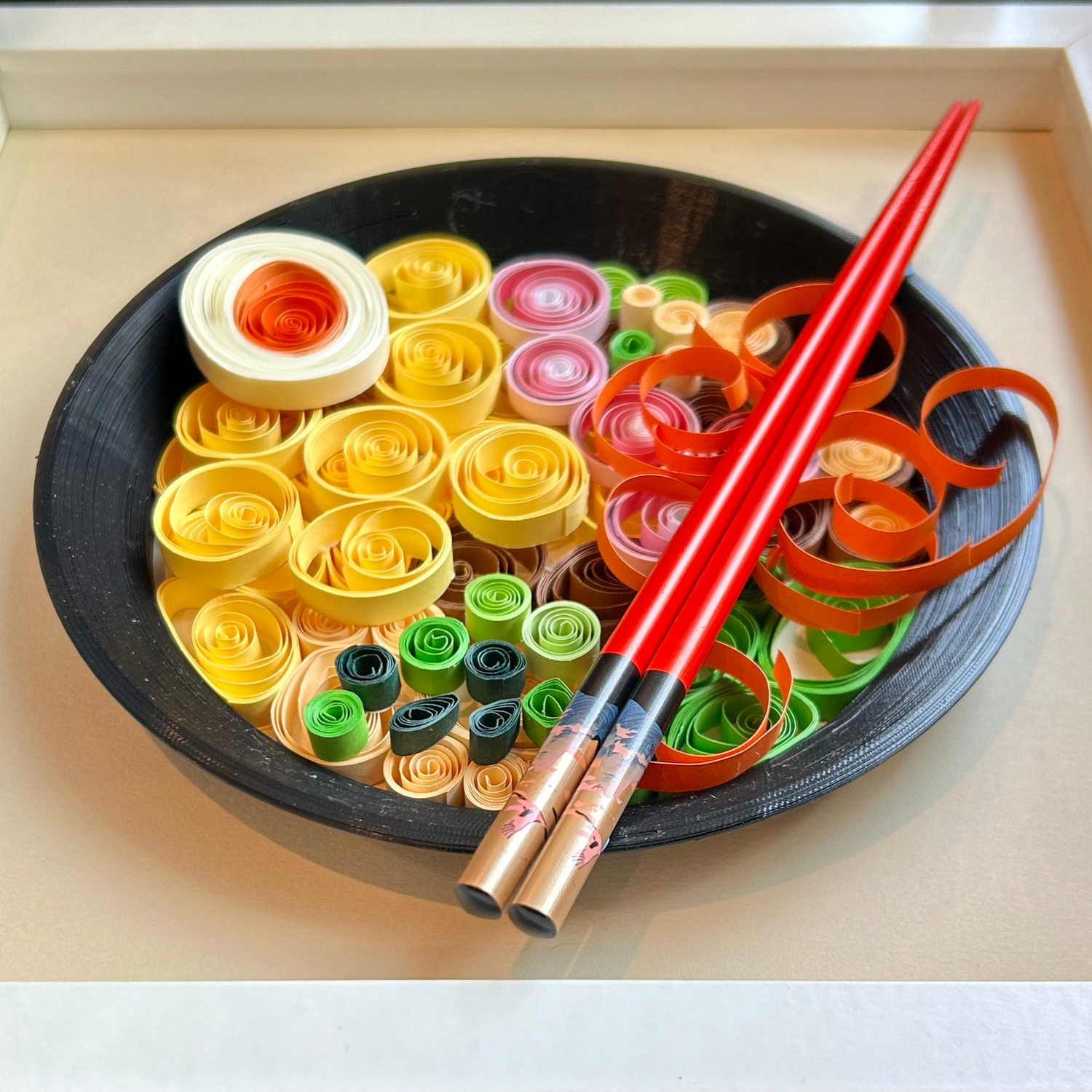 This playful ramen bowl-inspired paper quilling piece brings colorful noodles and vibrant details to life. A fun, handcrafted decor item for food lovers and art enthusiasts alike!